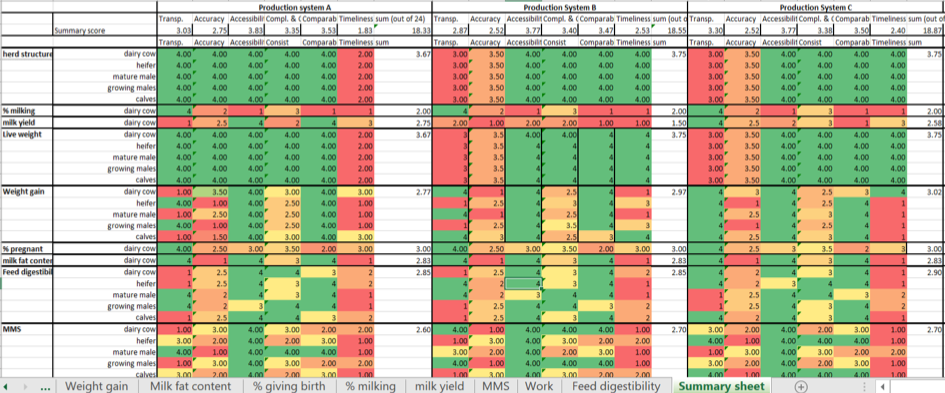 The indicators and scoring criteria are described in the ‘Indicators and scoring’ worksheet in the spreadsheet file. The spreadsheet file contains worksheets for each of the parameters required to estimate Tier 2 livestock GHG emissions, and a summary spreadsheet that visually shows which parameters score higher or lower on each of the quality criteria (see example in the figure below). The spreadsheet is Tool B.16in the L-ADG. The template contains some illustrative contents that should be replaced by country-specific data when used. For further guidance on how to make effective use of the tool when compiling Tier 2 livestock GHG inventories, please refer to the main text of the L-ADG.